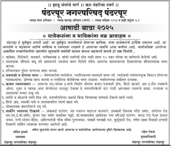 पंढरपूर नगरपरिषद पंढरपूर आषाढी यात्रा 2025 यात्रेकरूंना व भाविकांना नम्र आवाहन